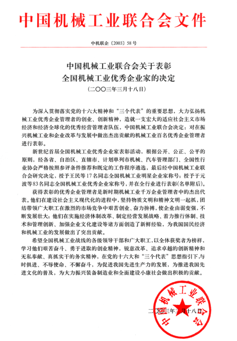 新世紀(jì)首屆全國(guó)機(jī)械工業(yè)優(yōu)秀企業(yè)家名單 |
