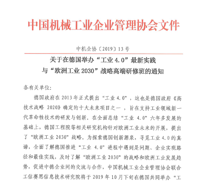 關(guān)于在德國(guó)舉辦“工業(yè)4.0”最新實(shí)踐與“歐洲工業(yè)2030”戰(zhàn)略高端研修班的通知-中機(jī)企協(xié)〔2019〕13號(hào).pdf