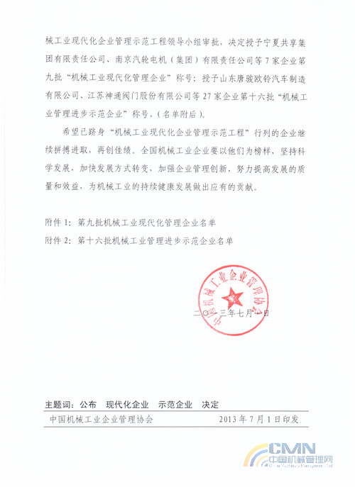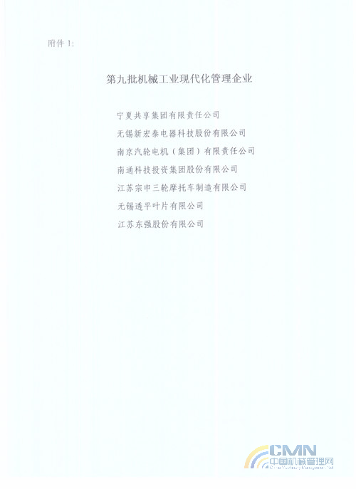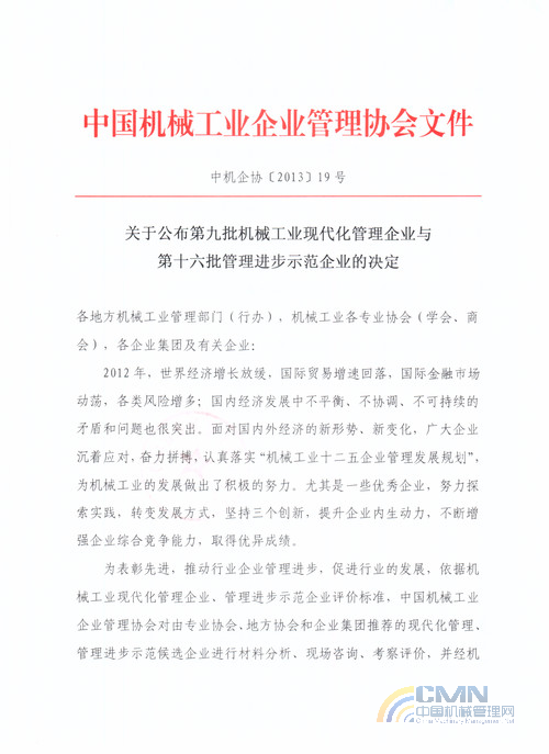 關于公布第九批機械工業(yè)現(xiàn)代化管理企業(yè)與第十六批管理進步示范企業(yè)的決定