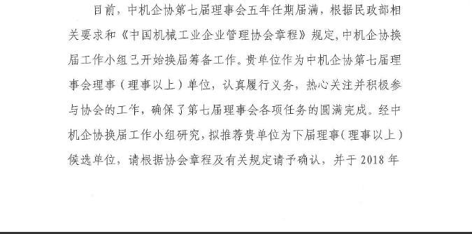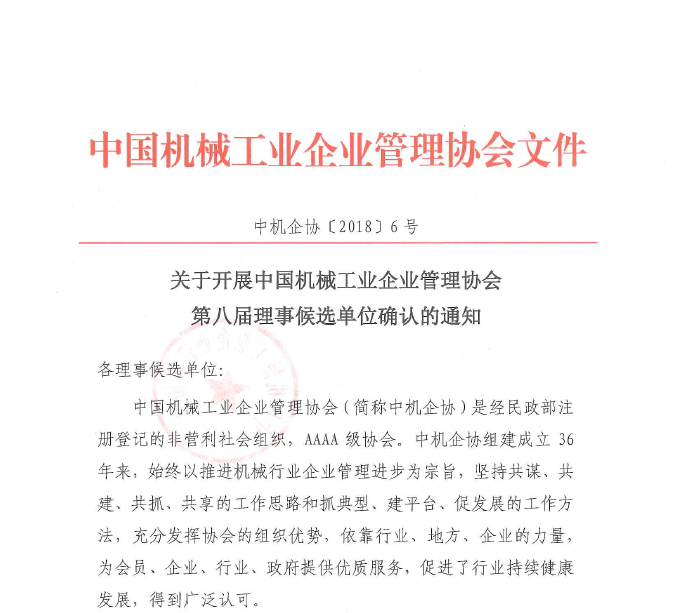 關(guān)于開(kāi)展中國(guó)機(jī)械工業(yè)企業(yè)管理協(xié)會(huì)第八屆理事候選單位確認(rèn)的通知