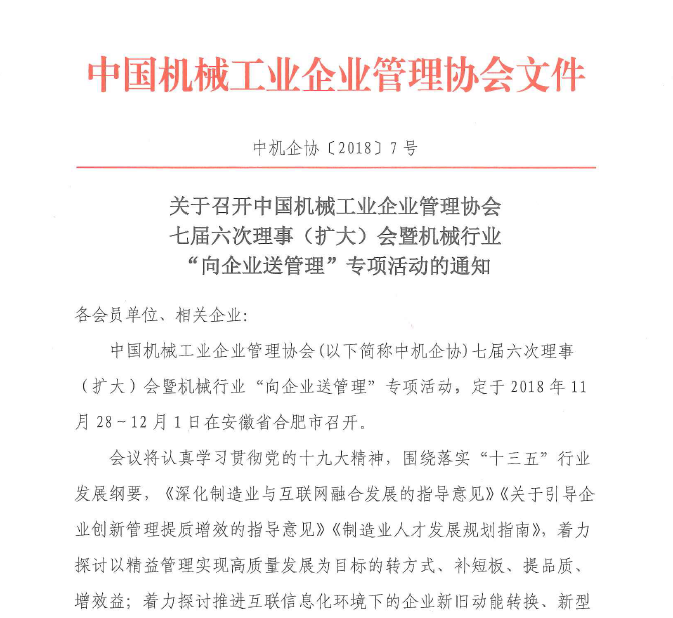 中機(jī)企協(xié)七屆六次理事(擴(kuò)大)會暨機(jī)械行業(yè)“向企業(yè)送管理”專項活動通知