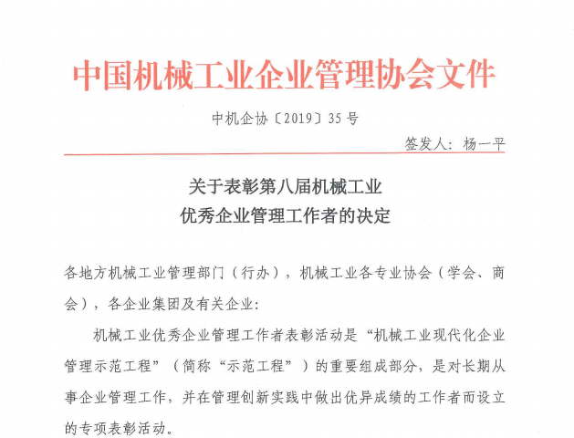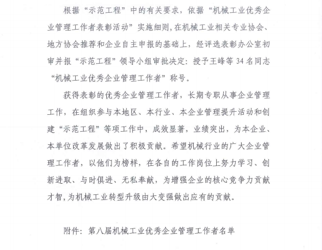 關(guān)于表彰第八屆機(jī)械工業(yè)優(yōu)秀企業(yè)管理工作者的決定