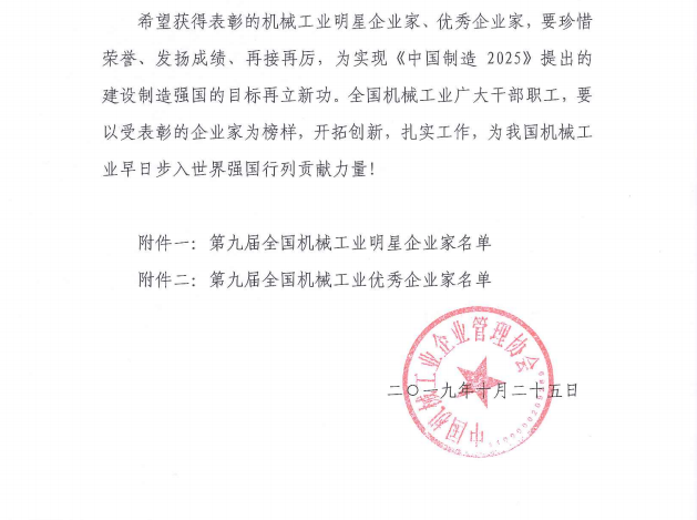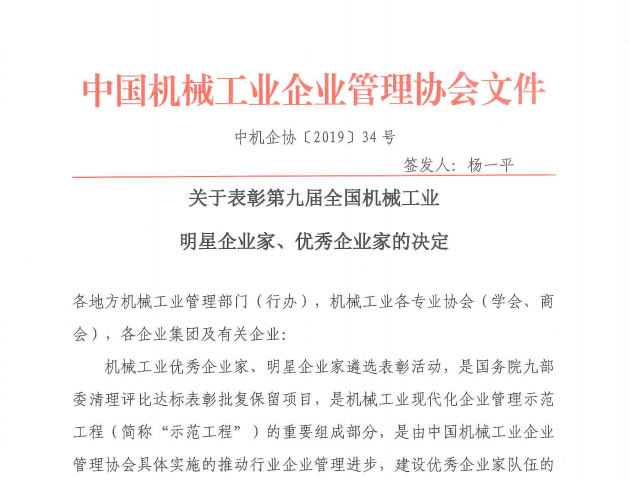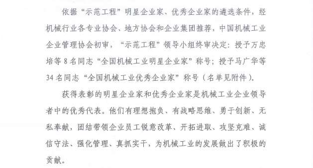 關(guān)于表彰第九屆全國(guó)機(jī)械工業(yè)明星企業(yè)家、優(yōu)秀企業(yè)家的決定